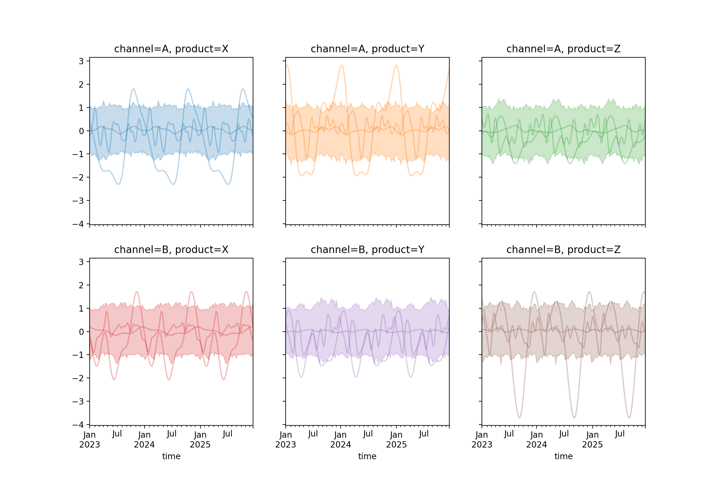 import numpy as np import pandas as pd import pymc as pm import matplotlib.pyplot as plt from pymc_marketing.mmm import HSGPPeriodic from pymc_marketing.prior import Prior seed = sum(map(ord, "Higher dimensional HSGP with periodic data")) rng = np.random.default_rng(seed) n = 52 * 3 dates = pd.date_range("2023-01-01", periods=n, freq="W-MON") X = np.arange(n) scale = Prior("HalfNormal", sigma=1) ls = Prior("InverseGamma", alpha=2, beta=1) hsgp = HSGPPeriodic( X=X, scale=scale, ls=ls, m=20, cov_func="periodic", period=52, dims=("time", "channel", "product"), ) coords = { "time": dates, "channel": ["A", "B"], "product": ["X", "Y", "Z"], } prior = hsgp.sample_prior(coords=coords, random_seed=rng) curve = prior["f"] fig, axes = hsgp.plot_curve( curve, n_samples=3, random_seed=rng, subplot_kwargs={"figsize": (12, 8), "ncols": 3}, ) plt.show()