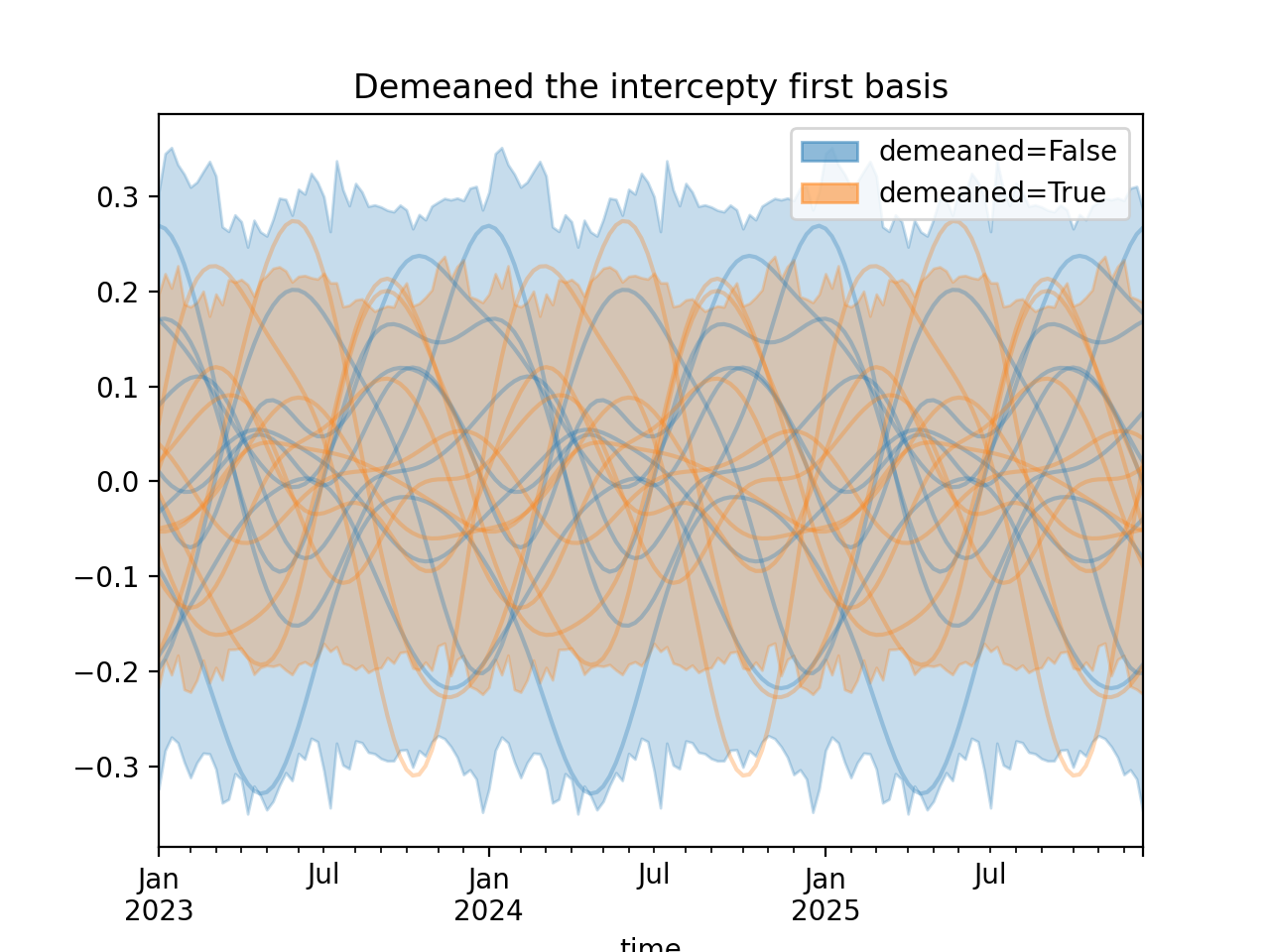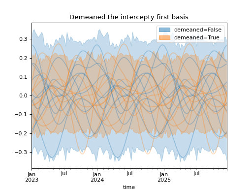 import numpy as np import pandas as pd import xarray as xr import matplotlib.pyplot as plt from pymc_marketing.mmm import HSGPPeriodic from pymc_marketing.plot import plot_curve seed = sum(map(ord, "Periodic GP")) rng = np.random.default_rng(seed) scale = 0.25 ls = 1 kwargs = dict(ls=ls, scale=scale, period=52, cov_func="periodic", dims="time", m=20) n = 52 * 3 dates = pd.date_range("2023-01-01", periods=n, freq="W-MON") X = np.arange(n) coords = {"time": dates} hsgp = HSGPPeriodic(demeaned_basis=False, **kwargs).register_data(X) hsgp_demeaned = HSGPPeriodic(demeaned_basis=True, **kwargs).register_data(X) def sample_curve(hsgp): return hsgp.sample_prior(coords=coords, random_seed=rng)["f"] non_demeaned = sample_curve(hsgp).rename("False") demeaned = sample_curve(hsgp_demeaned).rename("True") combined = xr.merge([non_demeaned, demeaned]).to_array("demeaned") _, axes = combined.pipe(plot_curve, "time", same_axes=True) axes[0].set(title="Demeaned the intercepty first basis") plt.show()