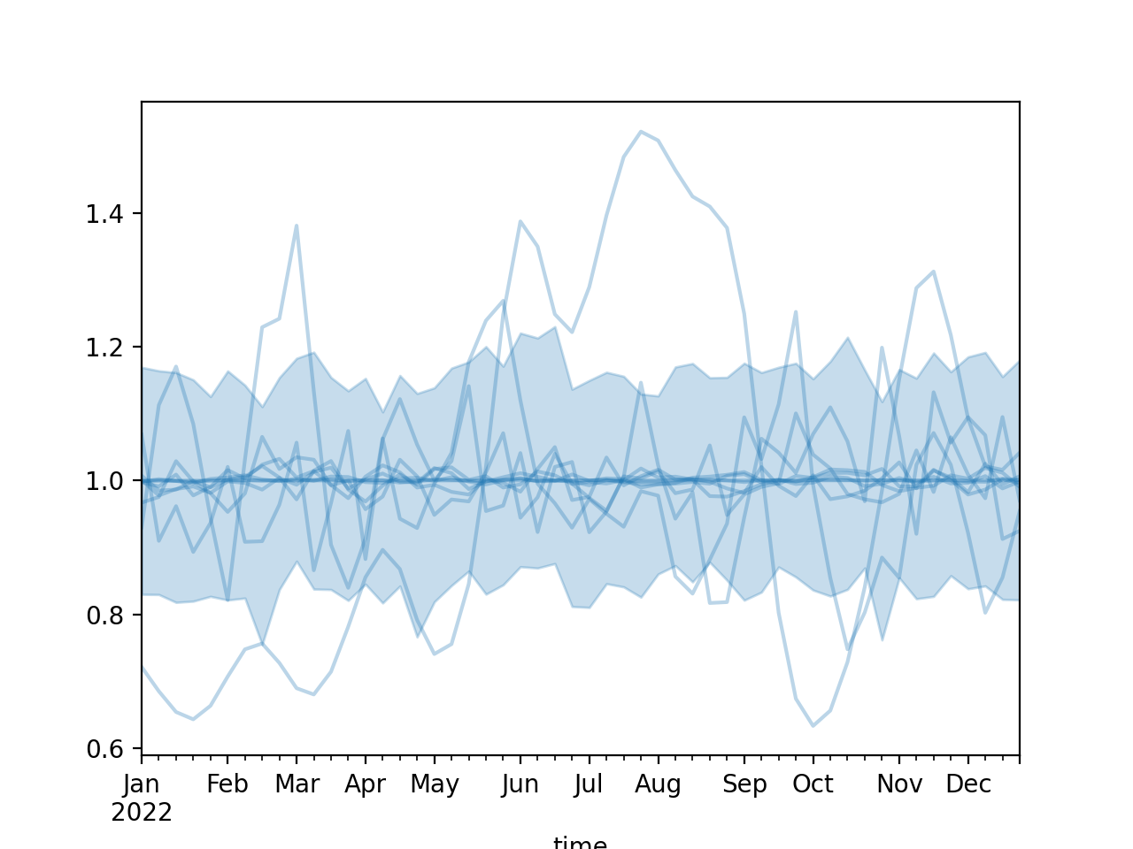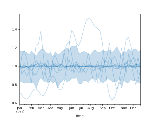 import numpy as np import pandas as pd import matplotlib.pyplot as plt from pymc_marketing.mmm import SoftPlusHSGP seed = sum(map(ord, "Out of the box GP")) rng = np.random.default_rng(seed) n = 52 X = np.arange(n) hsgp = SoftPlusHSGP.parameterize_from_data( X=X, dims="time", ) dates = pd.date_range("2022-01-01", periods=n, freq="W-MON") coords = { "time": dates, } prior = hsgp.sample_prior(coords=coords, random_seed=rng) curve = prior["f"] hsgp.plot_curve(curve, random_seed=rng) plt.show()
