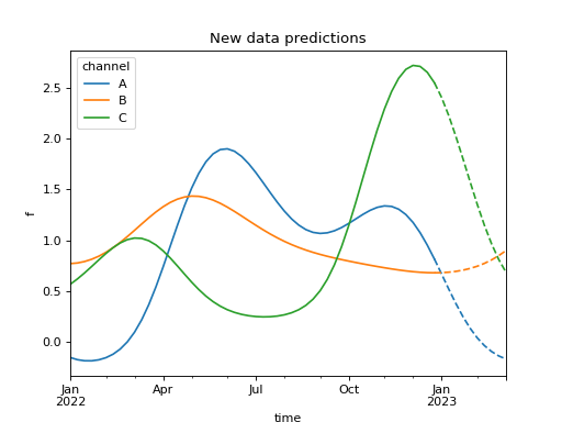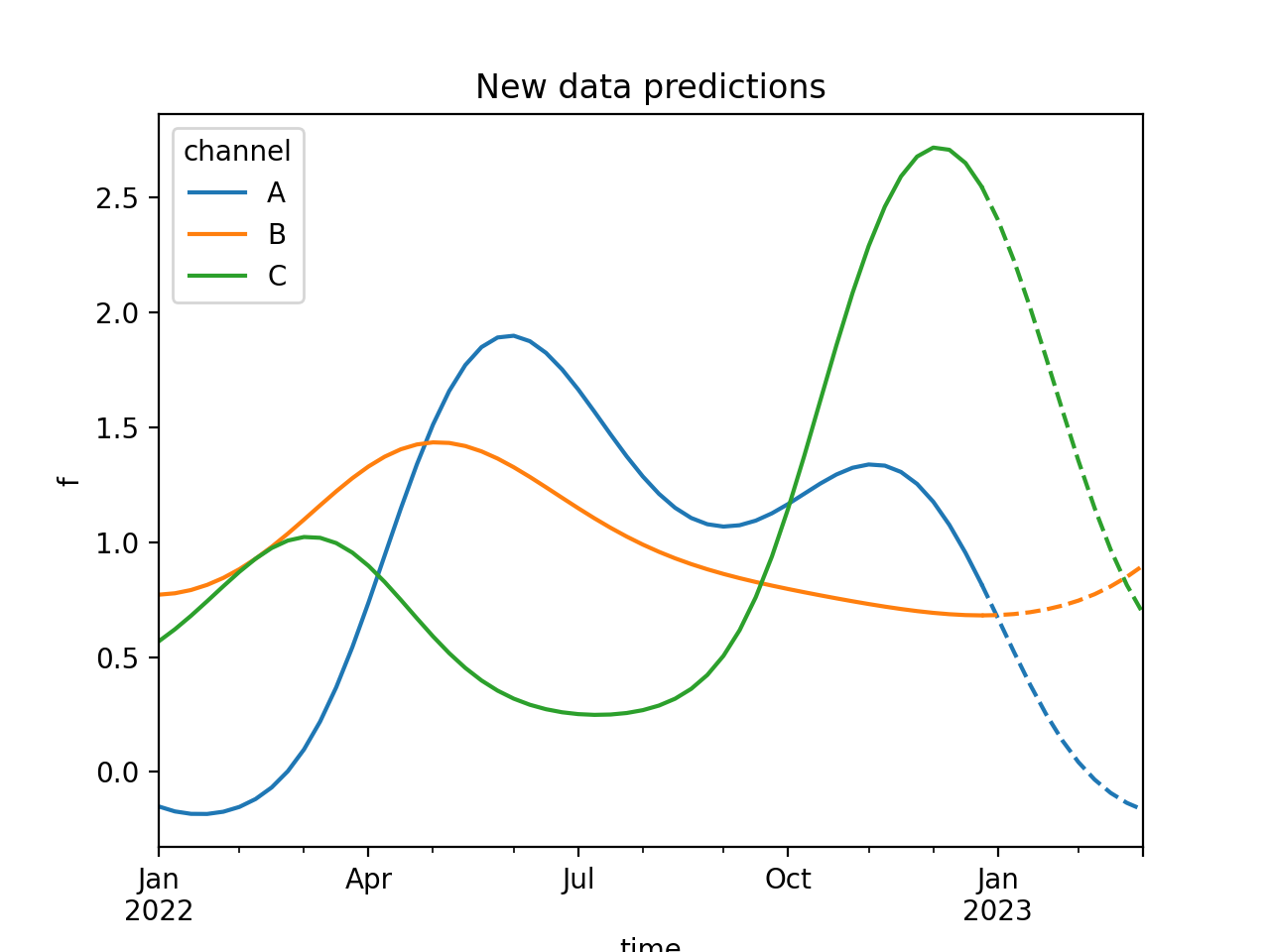 import numpy as np import pandas as pd import pymc as pm import matplotlib.pyplot as plt from pymc_marketing.mmm import SoftPlusHSGP from pymc_marketing.model_graph import deterministics_to_flat from pymc_marketing.prior import Prior seed = sum(map(ord, "New data predictions with SoftPlusHSGP")) rng = np.random.default_rng(seed) eta = Prior("Exponential", lam=1) ls = Prior("InverseGamma", alpha=2, beta=1) hsgp = SoftPlusHSGP( eta=eta, ls=ls, m=20, L=150, dims=("time", "channel"), ) n = 52 X = np.arange(n) channels = ["A", "B", "C"] dates = pd.date_range("2022-01-01", periods=n, freq="W-MON") coords = {"time": dates, "channel": channels} with pm.Model(coords=coords) as model: data = pm.Data("data", X, dims="time") hsgp.register_data(data).create_variable("f") idata = pm.sample_prior_predictive(random_seed=rng) prior = idata.prior n_new = 10 X_new = np.arange(n - 1 , n + n_new) last_date = dates[-1] new_dates = pd.date_range(last_date, periods=n_new + 1, freq="W-MON") with deterministics_to_flat(model, hsgp.deterministics_to_replace("f")): pm.set_data( new_data={ "data": X_new, }, coords={"time": new_dates}, ) post = pm.sample_posterior_predictive( prior, var_names=["f"], random_seed=rng, ) chain, draw = 0, rng.choice(prior.sizes["draw"]) colors = [f"C{i}" for i in range(len(channels))] def get_sample(curve): return curve.loc[chain, draw].to_series().unstack() ax = prior["f"].pipe(get_sample).plot(color=colors) post.posterior_predictive["f"].pipe(get_sample).plot( ax=ax, color=colors, linestyle="--", legend=False ) ax.set(xlabel="time", ylabel="f", title="New data predictions") plt.show()